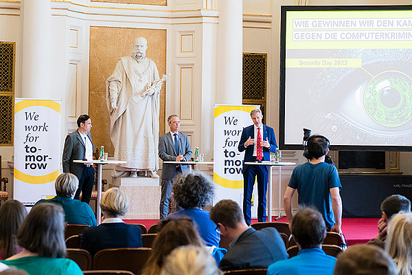 The cyber attack on the University of Graz on 3 February 2023 has left its traces. Multi-factor authentication, connection via a virtual private network off campus and stricter network segmentation have since guaranteed more security for all members of the University of Graz in cyberspace. At the "Security Day" - an information event that took place on World Password Day - Rector Peter Riedler, Vice Rector Markus Fallenböck and the head of the information management Christian Marzulf informed on these topics.