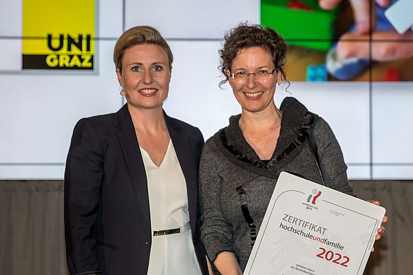 The reconciliation of family and career is becoming increasingly important for employers. With unikid and unicare, the University of Graz has already been offering a number of qualified programmes for many years. The University was recently re-certified with the quality label for a family-friendly university. The ceremonial presentation of the certificate by the Federal Minister for Women and Family, Susanne Raab, took place in Vienna.