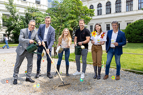 Im Rahmen einer sommerlichen Saatgut-Aktion streuten Rektor Peter Riedler, Vizerektor Markus Fallenböck, der deutsche Fußballtrainer und Bienenbotschafter Franco Foda sowie Manfred Hohensinner, Geschäftsführer von Frutura Obst & Gemüse Kompetenzzentrum GmbH, die ersten Samen für eine bunte und leuchtende Blühecke am Campus der Universität Graz. Die Pflanzen sollen den Bienen als Nahrungsquelle dienen.