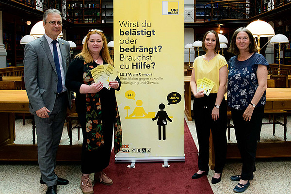 LUIS*A ist da – jetzt auch an der Uni Graz. Die Kampagne der Stadt Graz gegen sexuelle Belästigung und Gewalt, die 2019 in Lokalen gestartet wurde, bietet nun erstmals auch an einer österreichischen Universität allen Personen, die am Campus von sexuellen Übergriffen betroffen sind, rasch und unkompliziert Schutz. Am 1. Juni 2023 wurde an der Uni Graz im Rahmen einer Pressekonferenz mit Bürgermeisterin Elke Kahr der erste „LUIS*A-Spot“ in der Universitätsbibliothek eröffnet. >> mehr erfahren