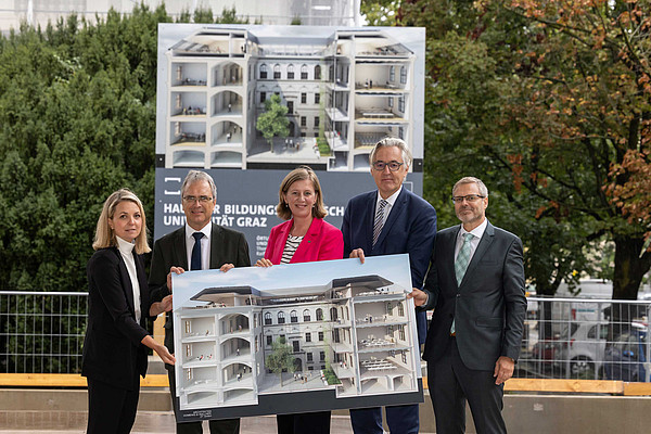 Der Campus der Uni Graz wird noch attraktiver und klimafreundlicher. Die Bundesimmobiliengesellschaft saniert das 125 Jahre alte, denkmalgeschützte Gebäude Universitätsplatz 4 von Grund auf. Wo früher medizinische Institute beheimatet waren, werden 2027 die Bildungswissenschaften der Uni Graz einziehen. Am 12. September 2024 gaben Generalsekretär Martin Netzer in Vertretung von Wissenschaftsminister Martin Polaschek, Landesrätin Barbara Eibinger-Miedl, Richard Schöberl von der BIG und Rektor Peter Riedler den offiziellen Startschuss für Sanierung und Umbau. Die BIG und die Uni Graz bauen für die Zukunft und danken für das Verständnis, sollten die Arbeiten auf der Baustelle zu erhöhtem Lärm- und Verkehrsaufkommen führen. >> mehr erfahren The campus of the University of Graz is becoming even more attractive and climate-friendly. The Bundesimmobiliengesellschaft (BIG) is completely renovating the 125-year-old listed building at Universitätsplatz 4. In 2027, the University of Graz's educational sciences will move in where medical departments used to be located. On 12 September 2024, Secretary General Martin Netzer, representing Minister Martin Polaschek, Provincial Councillor Barbara Eibinger-Miedl, Richard Schöberl from BIG and Rector Peter Riedler gave the official go-ahead for the renovation and conversion.