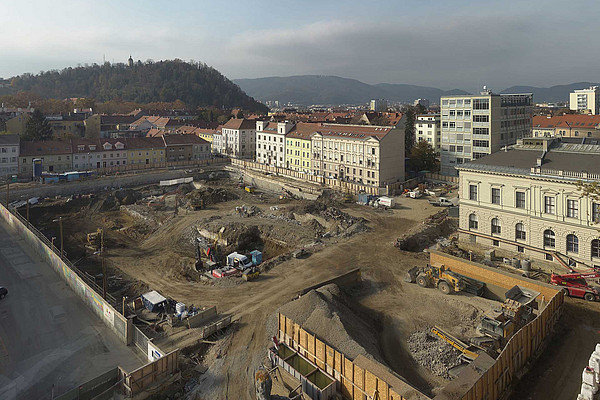 In addition to the general renovation of the building at Universitätsplatz 4, which began in the summer and which, as is well known, will be converted into the home of the educational sciences by 2027, the preparatory work for the Graz Center of Physics – one of the ten flagship projects of the University of Graz – is going according to plan. The demolition of the basement of the old pre-clinic will enter its final phase in the coming weeks.
