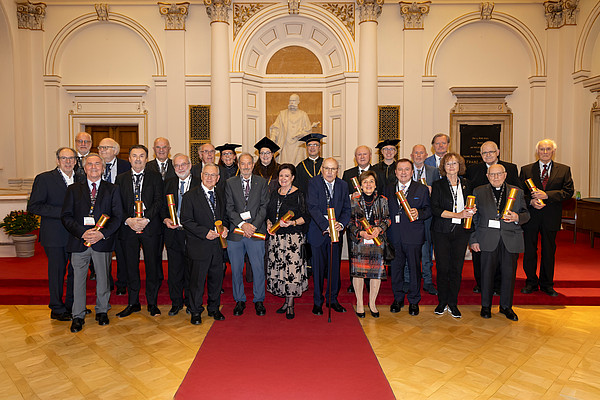 39 Persönlichkeiten, die im Jahr 1974 an der Universität Graz promovierten, leisteten am 11. November 2024 nach 50 Jahren in der Aula erneut den akademischen Eid. Für die langjährige Verbundenheit zu ihrer Alma Mater wurde den Absolvent:innen im Anschluss an das Versprechen im Beisein von Rektor Peter Riedler das „Goldene Doktordiplom“ feierlich überreicht. Diese besondere Ehrung unterstreicht nicht nur die Wertschätzung der Universität Graz für die Errungenschaften ihrer Alumni, sondern würdigt auch die Weitergabe von Wissen über Generationen hinweg. Die Nominierung für das Goldene Doktordiplom erfolgt auf Antrag der jeweiligen Fakultät. >> mehr erfahren Thirty-nine personalities who received their doctorates from the University of Graz in 1974 returned to the Aula to take the academic oath again on 11 November 2024, 50 years later. In recognition of their long-standing ties to their alma mater, the graduates were ceremoniously presented with the ‘Golden Doctorate Diploma’ in the presence of Rector Peter Riedler after taking the oath. This special honour not only underlines the University of Graz's appreciation of the achievements of its alumni, but also recognises the passing on of knowledge across generations. Nomination for the Golden Doctorate is at the request of the respective faculty.