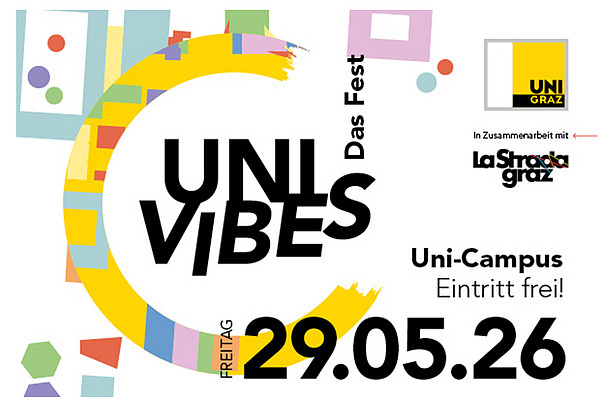 Uni Vibes is the University of Graz's festival, inviting everyone to celebrate again on 29 May 2026 from 6 p.m. on the University of Graz campus. In collaboration with La Strada, artistic performances, scientific impulses, guided tours and music will transcend borders and facilitate encounters. The programme promises another unique experience with DJs, concerts and exciting insights into our science, research and culture. If you would like to draw attention to Uni Vibes, please feel free to use the theme of this year's festival. It is available in various formats here. >> Learn more (German only)
