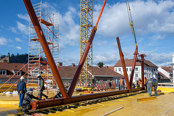 Architektonischer Meilenstein für das künftige Grazer Physik-Center: Die ersten Fachwerkteile wurden am 23. Februar in den frühen Morgenstunden angeliefert und mit dem Kran auf die richtige Stelle im ersten Obergeschoß platziert. Bis Mai folgen 33 weitere Lkw-Transporte und bringen insgesamt 64 Stück dieser Träger. Die acht Meter hohen und teilweise bis zu 30 Meter langen Fachwerke geben dem ganzen Gebäude eine notwendige Stabilität und dienen der Lastabtragung der oberen Geschoße. >> mehr erfahren